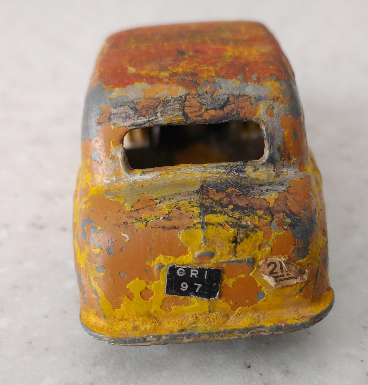 Very good basic condition with 25% paint loss. The tires were hard and had to be broken off. Otherwise a straightforward paint strip. Not immediately apparent, but after priming there was a ding in the roof above the rear left hand window. A little filler and re-primed followed by two top coats. In Progress............