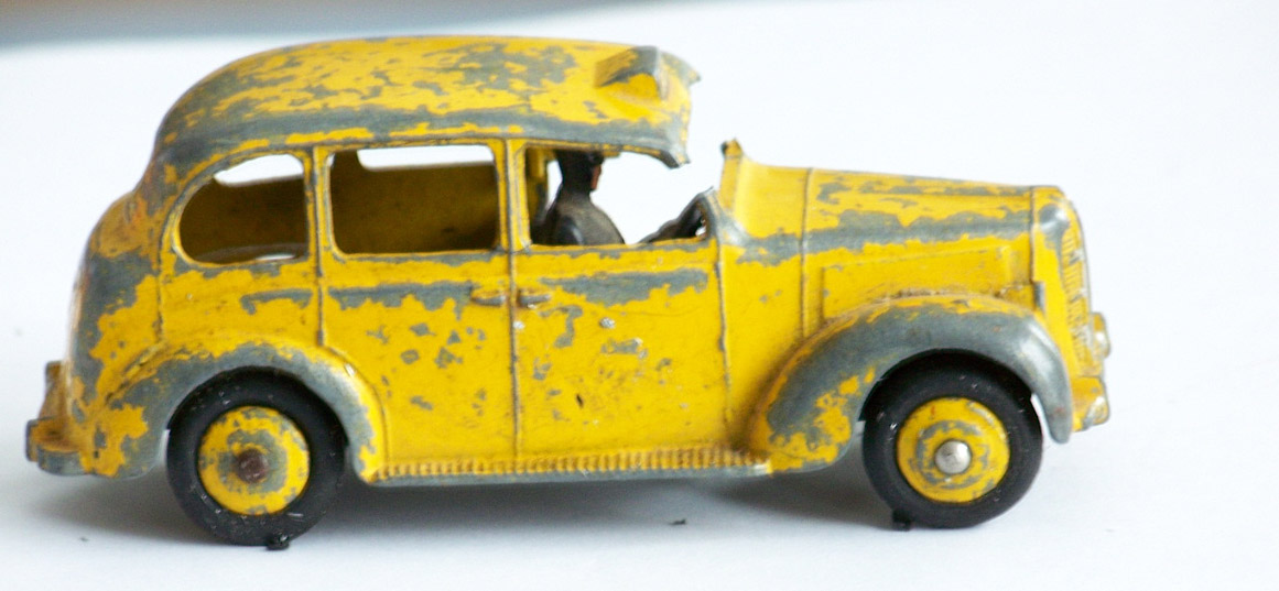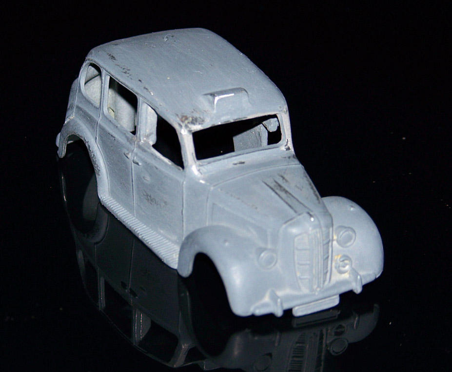 Very poor state with broken window pillars and twisted roof. This can be seen clearly in the pictures, check the back view. The base was in surprisingly good order with good paint including the driver but slightly twisted. The twist was easy to fix by hand. The base was removed with 2 mm starter holes and the rivet tops removed with a larger bit. The top was immersed in aircraft paint stripper prior to repair. The body was eased back into shape by gentle twisting by hand, anything other than this may have made the matter worse. Watch out for making any further cracks in any other area. Metal based epoxy resin was used over a piece of wire (telephone cable) for strength and layered up until there was enough material to work with. This was filed down and a further layer was added to repair small flaws. A coat of primer revealed a couple of minor flaws which were repaired and 400 grit wet and dry rub smoothed down minor imperfections. This is in progress and will be updated soon.