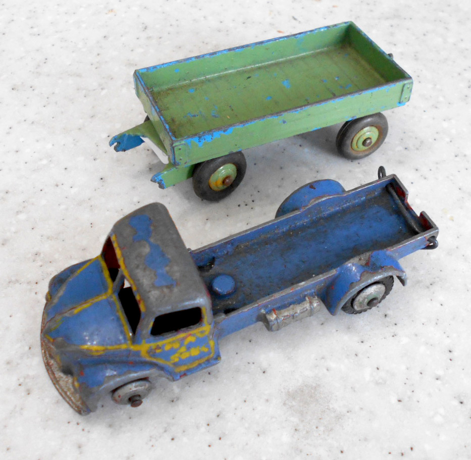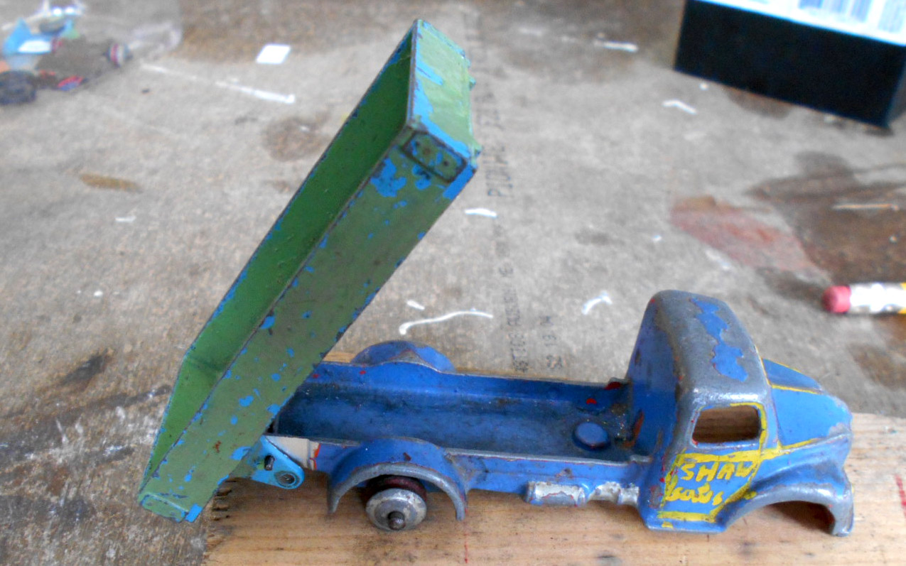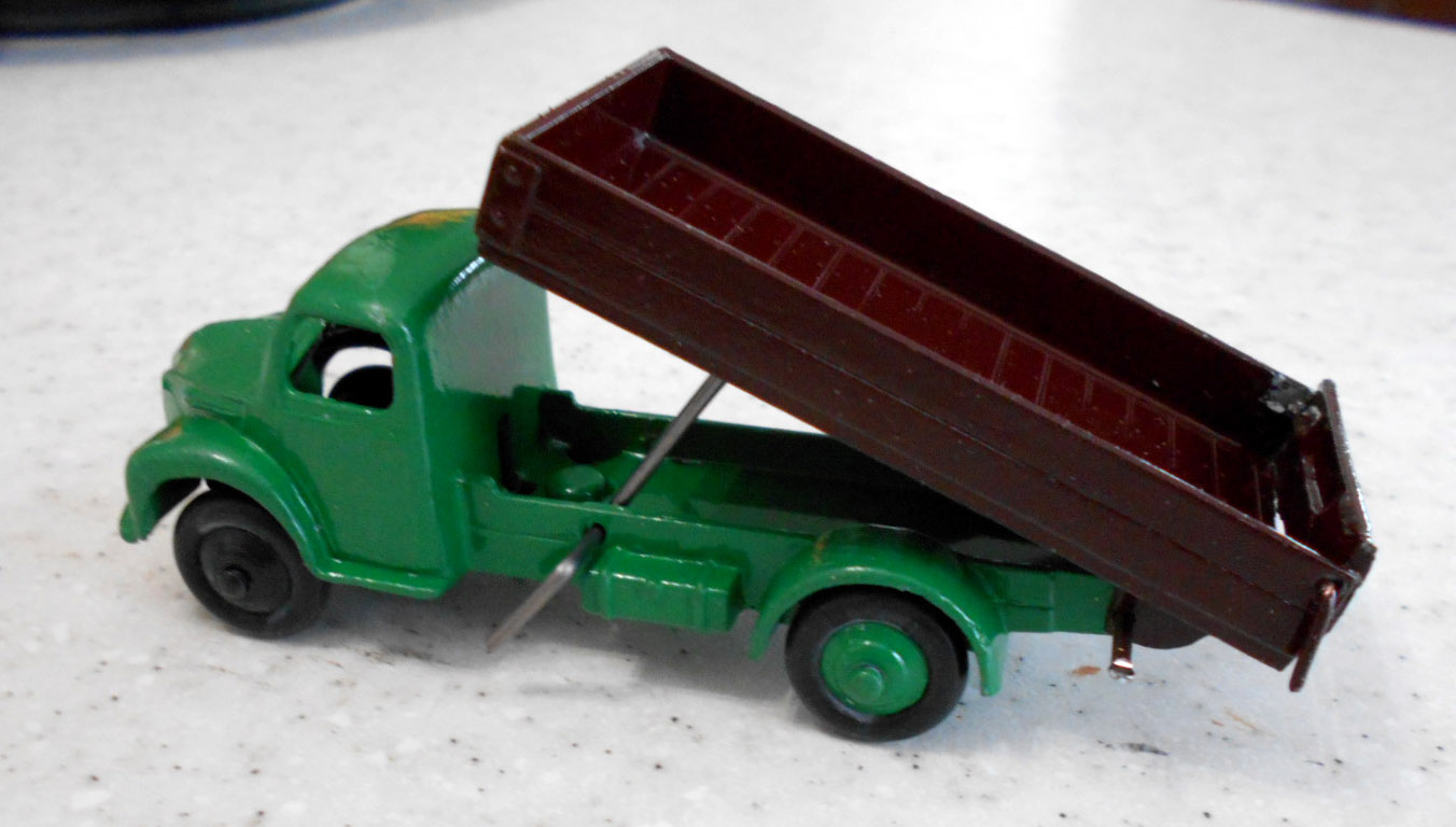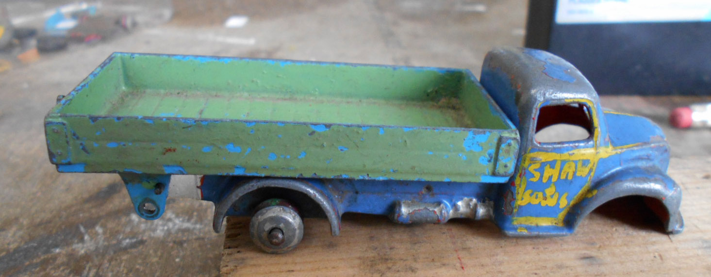 This model had the rear bed missing which is quite common. So I thought of a replacement by using the 4 wheel hand trailer that was missing the drawbar and the hinge hole was broken off. The dimensions looked OK but on matching up the tipping hinge width was just a few 100ths out, but by careful trimming it fitted just fine with new holes drilled in the trailer part just gave enough clearance. The rear end was removed and trimmed to fit and a hinge added. I may redo this part, not quite happy with it but it works. A new lifting mechanism was created and it all went together quite well. Note the images to see additional trimming to the trailer part.