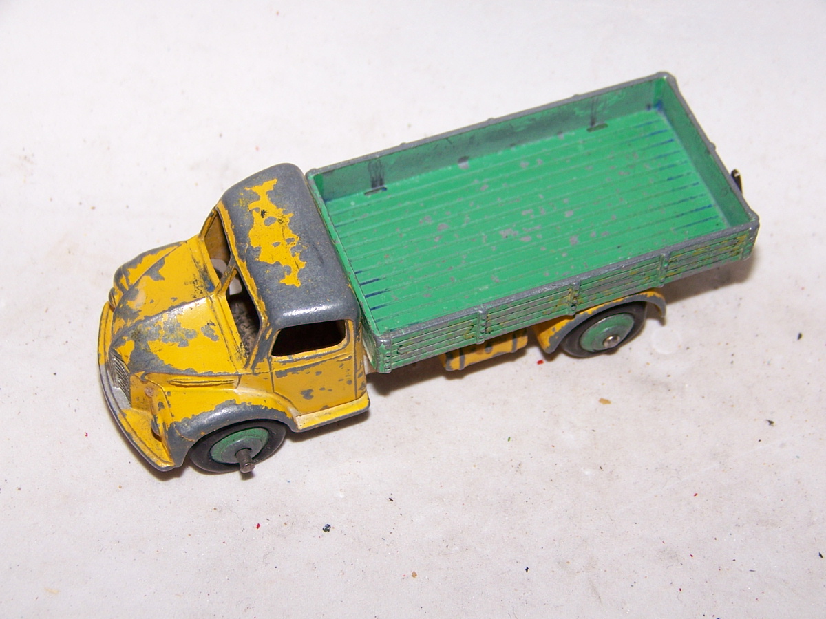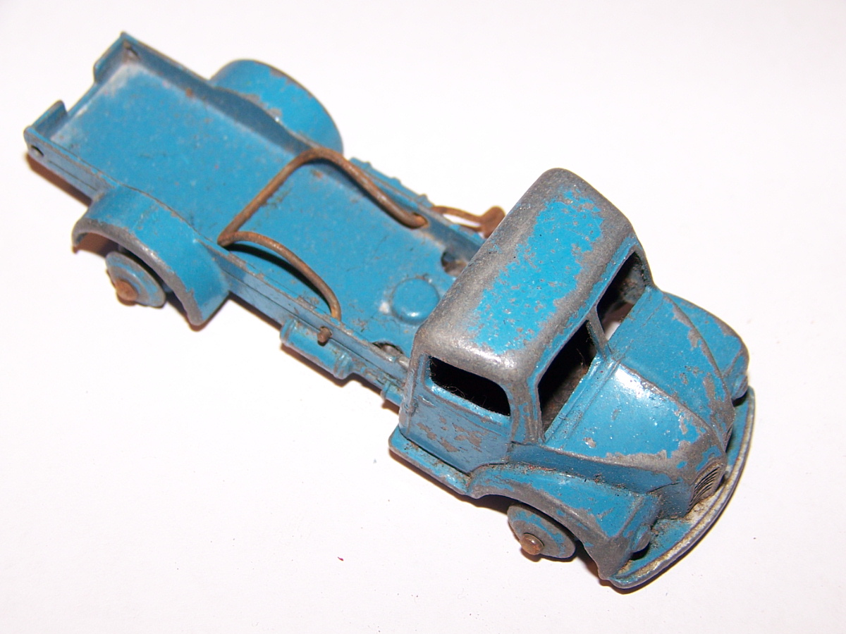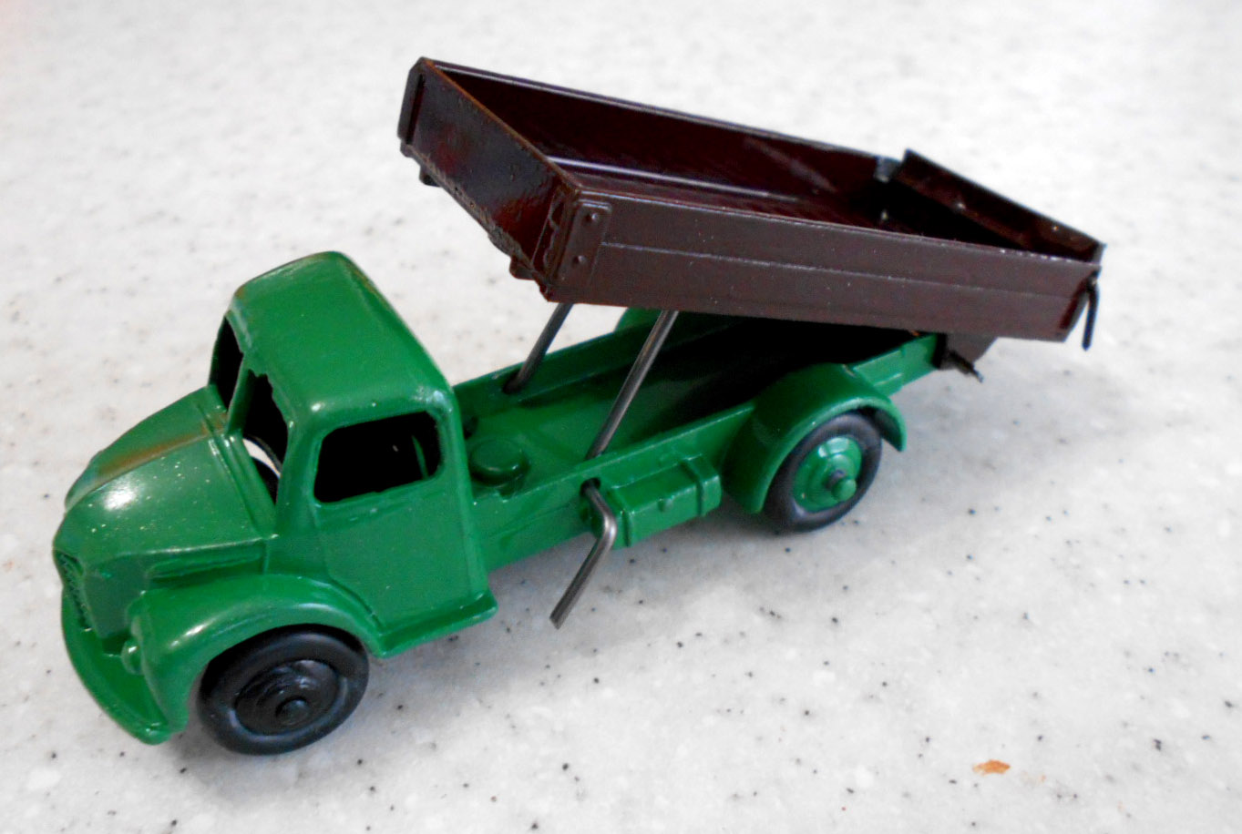 This model had the rear bed missing which is quite common. So I thought of a replacement by using the 4 wheel hand trailer that was missing the drawbar and the hinge hole was broken off. The dimensions looked OK but on matching up the tipping hinge width was just a few 100ths out, but by careful trimming it fitted just fine with new holes drilled in the trailer part just gave enough clearance. The rear end was removed and trimmed to fit and a hinge added. I may redo this part, not quite happy with it but it works. A new lifting mechanism was created and it all went together quite well. Note the images to see additional trimming to the trailer part.