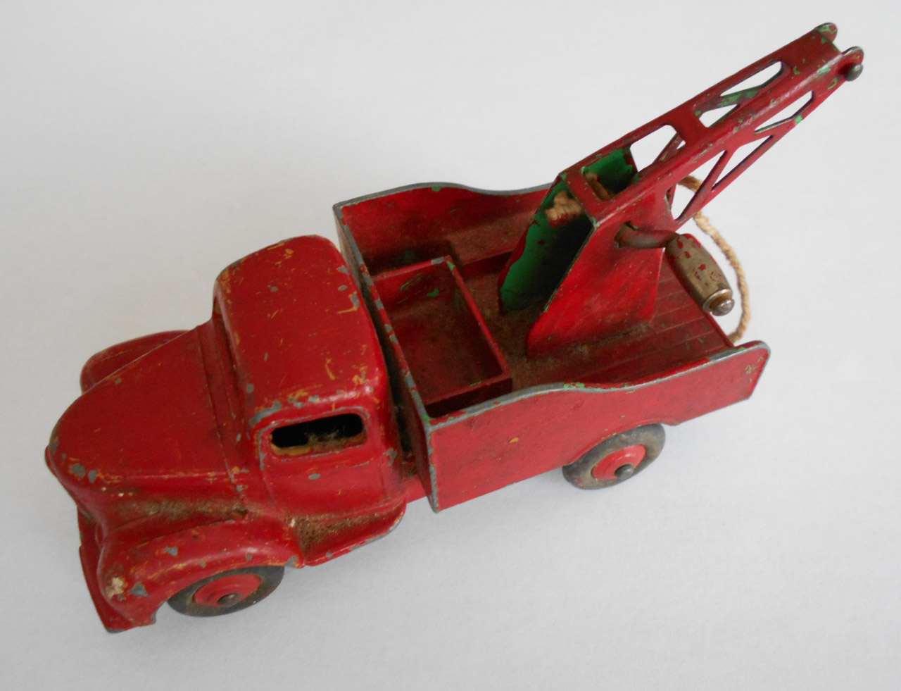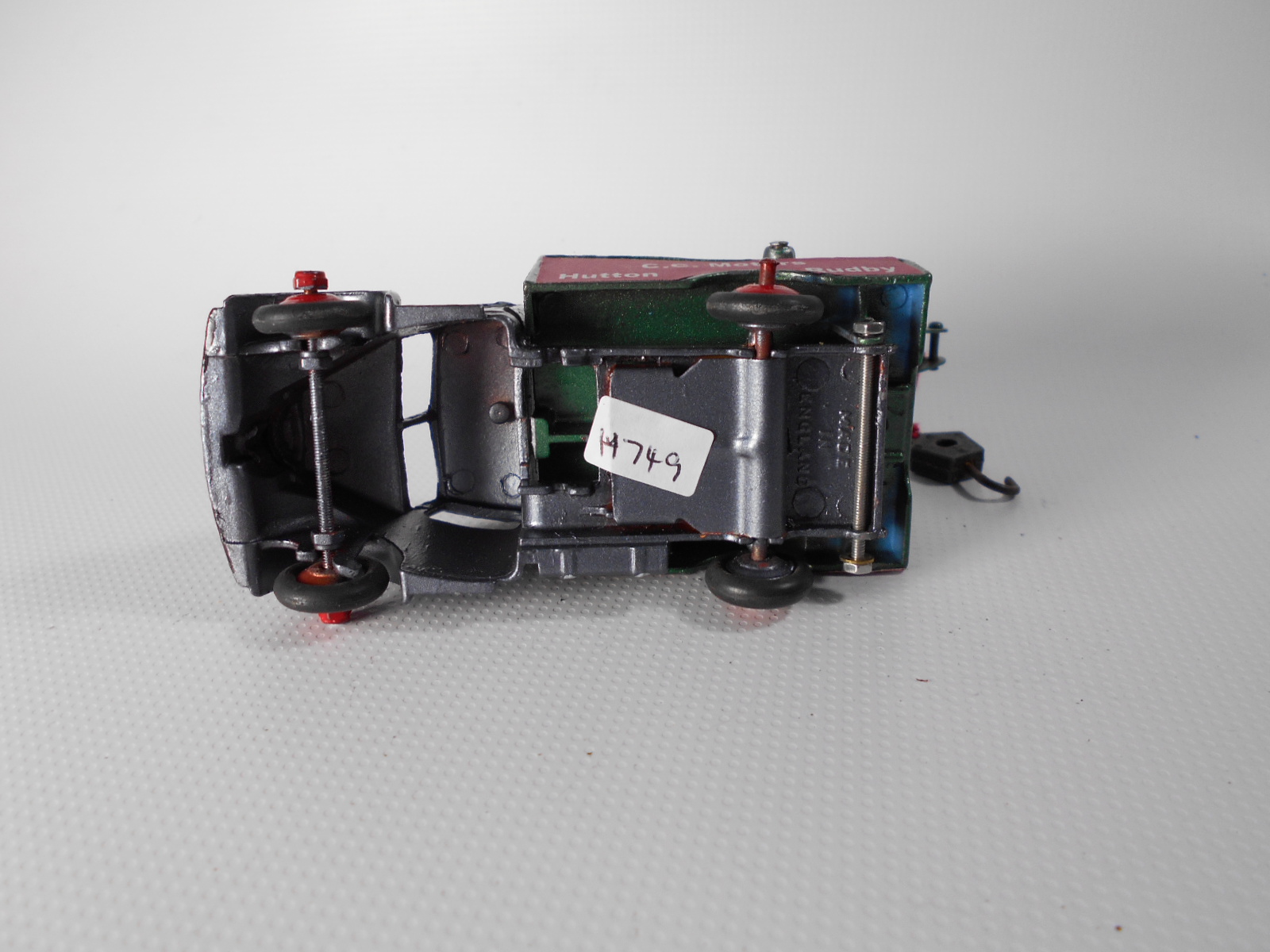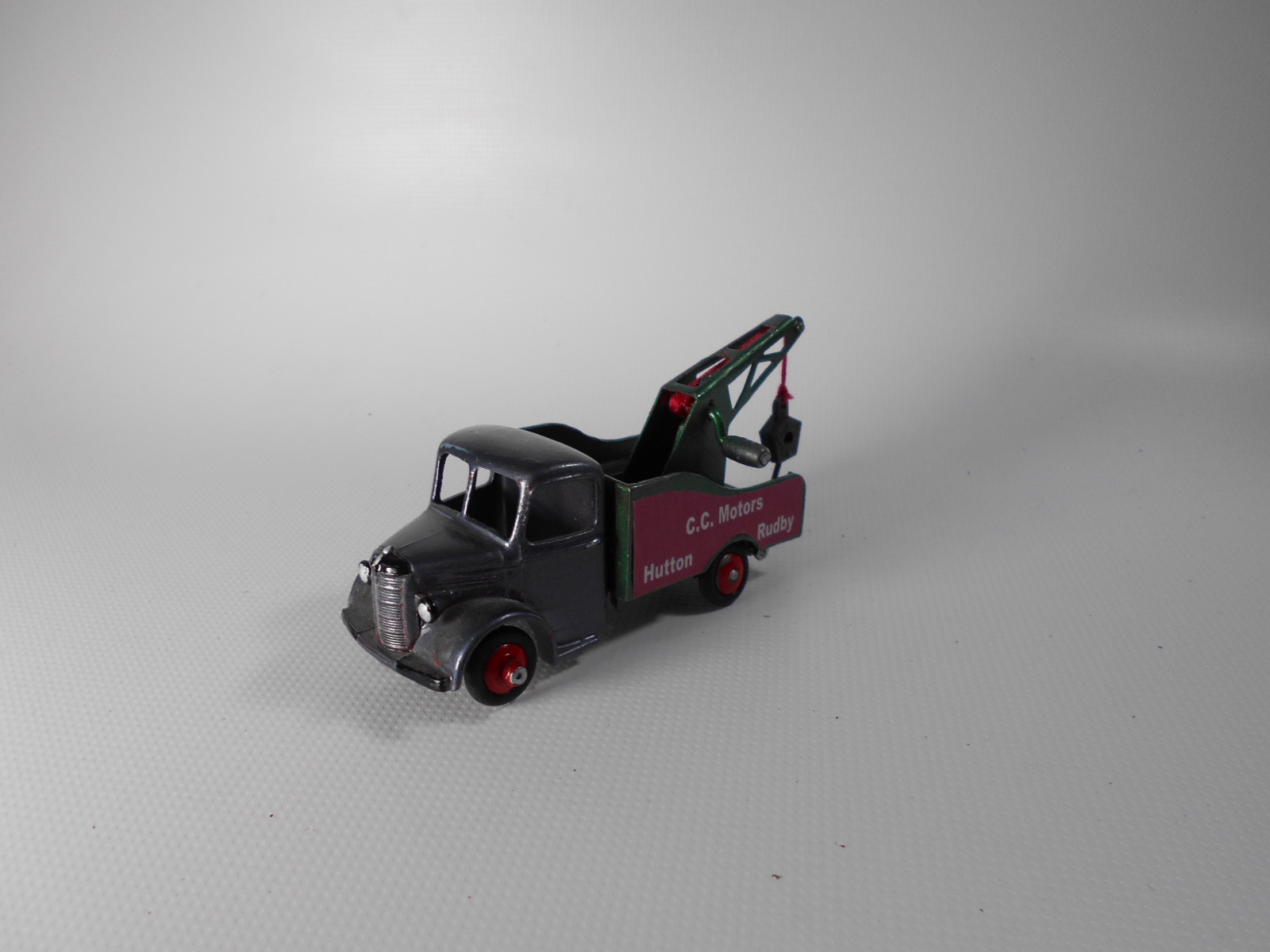 A lengthy overhaul of a badly overpainted commer breakdown lorry. The model was complete except for the hook and the string was rotted. Strip down was quite straightforward with just the deck hinge needing to be cut. Once the deck is off tabs need to be opened to release the chassis. All resprayed in need original colors and the winder retaining spring retensioned. A new decal was created and added either side. Also a box.