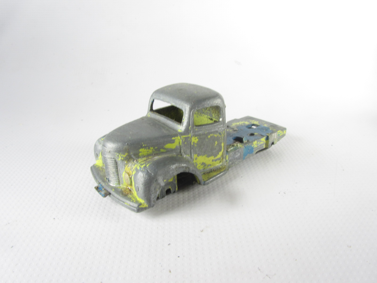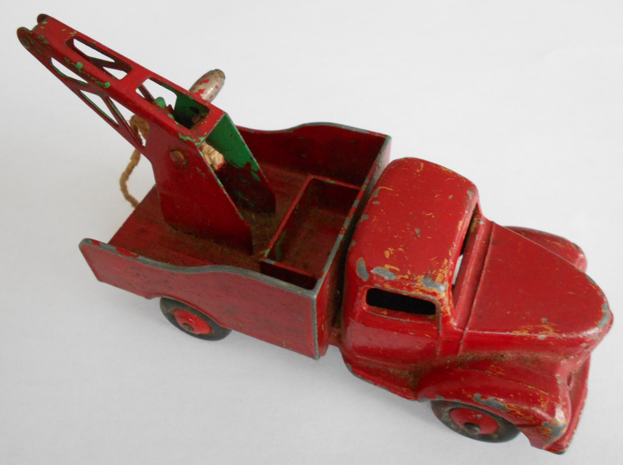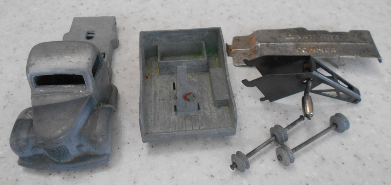 A lengthy overhaul of a badly overpainted commer breakdown lorry. The model was complete except for the hook and the string was rotted. Strip down was quite straightforward with just the deck hinge needing to be cut. Once the deck is off tabs need to be opened to release the chassis. All resprayed in need original colors and the winder retaining spring retensioned. A new decal was created and added either side. Also a box.