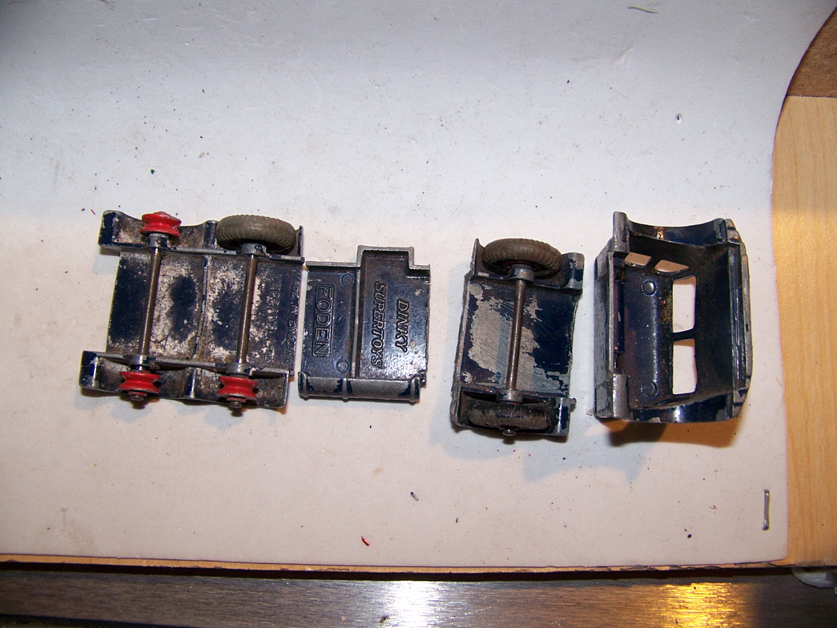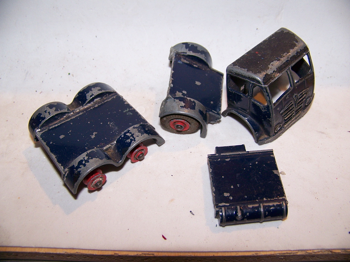 Broken Cab and poor repair, the cab was one time screwed and glued to the tailboard. Fender left side broken. A slight bend to one window pillar and tailboard header bent back, probably when the model was broken and cab separated from the chassis.